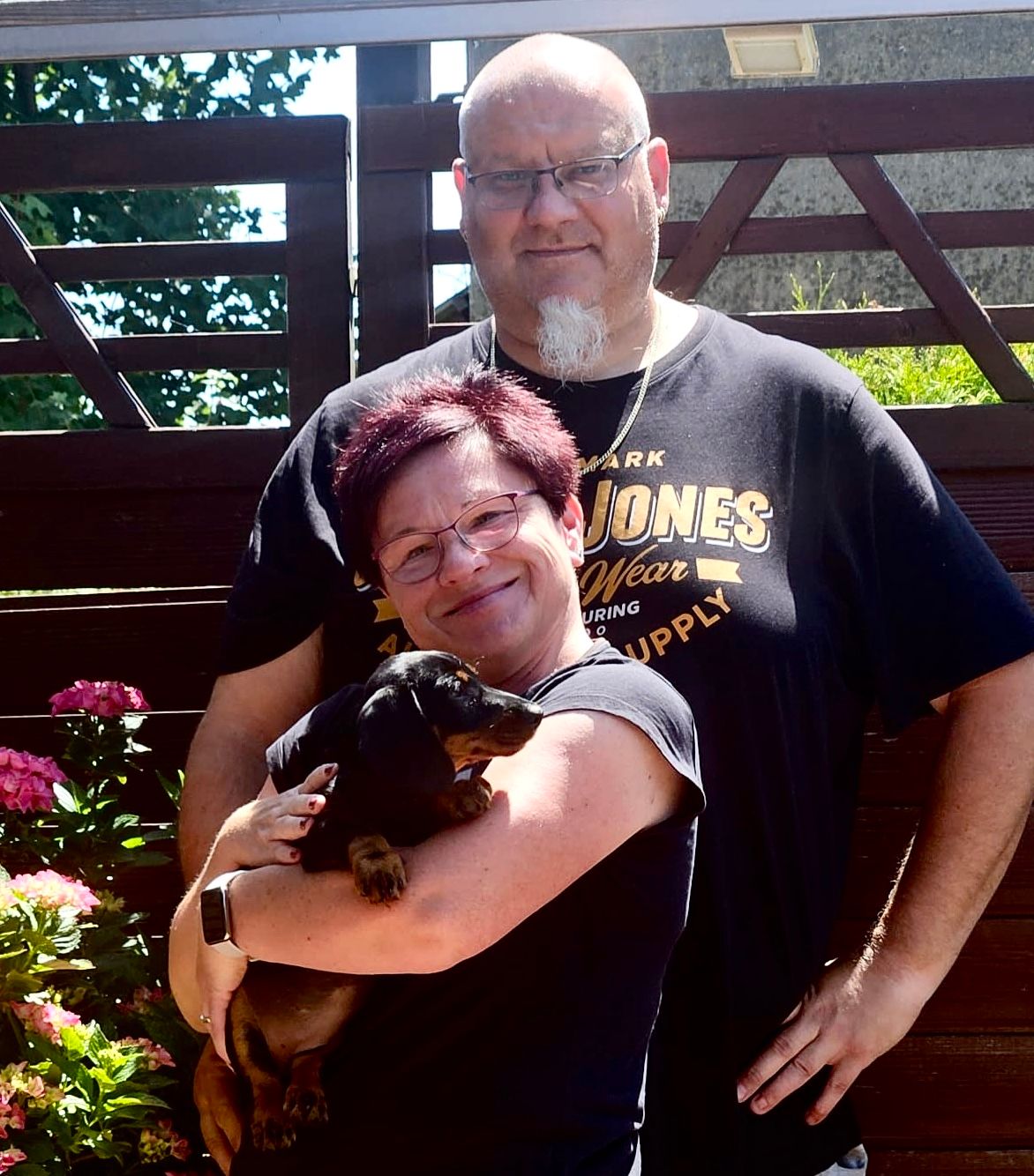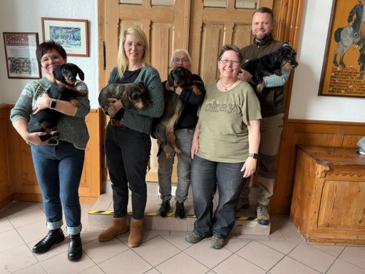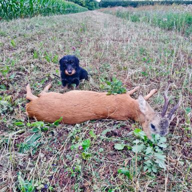 Die Welpen sind dunkel saufarben und schwarz-rot.